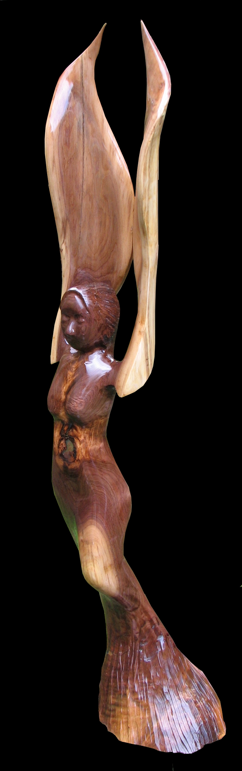 A combination of the idea of a Phoenix and a Butterfly emerging from a chrysalis. Black American Walnut